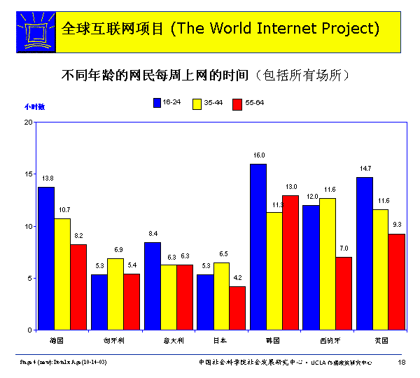 除几个明显的例外:匈牙利、西班牙和日本,年轻的网民比年老网民的平均上网时间更长。