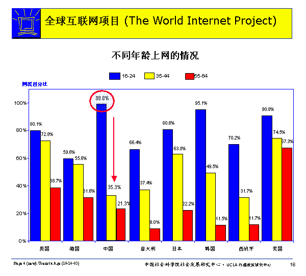 在WIP所有国家里,随着年龄增加,网民比例减少。某些国家的老年人比其他国家的更可能上网,例如:美国57.3%的55-64岁之间的人上网。而中国网民中的年龄差异则非常明显。由此可见,年龄是影响上网的一个重要因素。