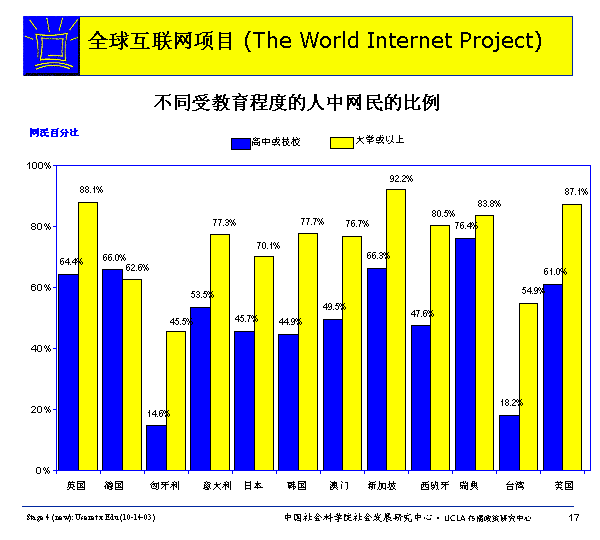 在WIP所有国家里,除德国外,有大学或以上学历的人比高中或职业学校学历的人更可能上网。可见,受教育程度也是影响上网的重要因素。