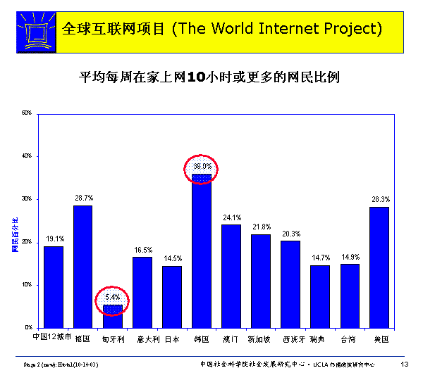 在WIP的国家里,韩国的每周在家上网平均10小时或更多的网民比例最高。36%的韩国网民每周在家上网平均10小时或更多,匈牙利网民只有5.4%如此。
