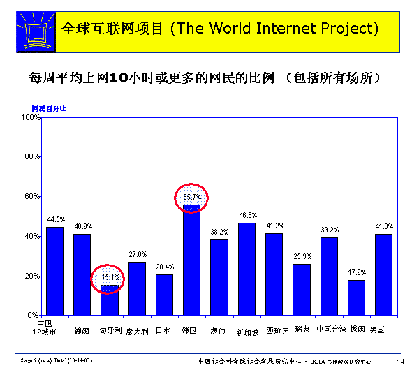 每周上网时间最多的是韩国人,55.7%网民每周上网10小时或更多(包括所有场所) ,匈牙利比例最低,只有15.1%的网民。