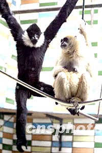 居住在北京动物园的十岁白颊长臂猿“精精”(图右),于二零零四猴年春节来临前,顺利产下一只幼崽。一月十六日,“精精”在夫君(图左,白颊长臂猿雄性为黑色)陪伴下精心护理怀中的小宝贝。