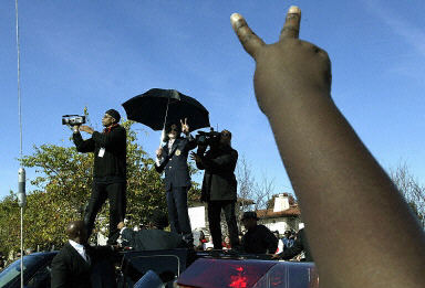 杰克逊在走到法庭建筑前时与一些歌迷握手并交谈。不少歌迷已在那里等候了12个小时之久。