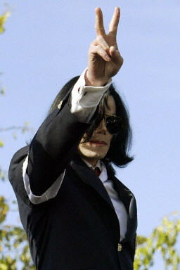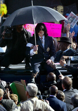 杰克逊在抵达加州圣玛丽亚法庭时受到一群手持欢迎标语牌和支持条幅的歌迷的欢迎。当杰克逊从汽车里走出来时,等候在那里的他的一些歌迷哭了起来,并唱起了歌,一些人挥动手中的声称“杰克逊是无辜的”支持标语。