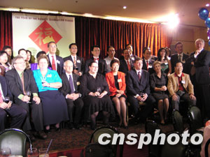 由澳洲华人公益金发起、新南威尔士州八十多个华人社团联合主办的农历新年联欢晚会23日在悉尼唐人街隆重举行。澳大利亚移民部长温思端(前排左2)、律政部长雷铎(前排左3)以及华人社团领袖与600多名嘉宾欢聚一堂,共祝澳洲繁荣稳定、人民安居乐业。中新社记者刘雨生摄