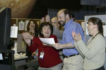“机遇”号火星探测器成功登陆的信号传回地球,美国国家宇航局喷气推进实验室的科学家一片欢腾。(AP)