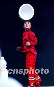 一名十岁的山西儿童春节期间在北京庙会上从容表演杂技“顶坛”。据悉,在中国民间有许多孩子从五岁左右开始习练杂技艺术,小小年纪便已身怀“绝技”。中新社记者:王丽南