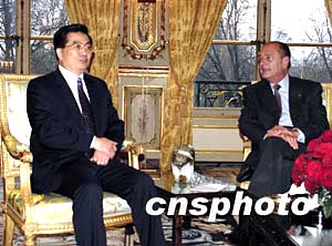 中新网1月27日电 据新华网报道,正在法国进行国事访问的中国国家主席胡锦涛与法国总统希拉克27日上午在爱丽舍宫举行会谈。