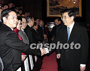 正在法国进行国事访问的中国国家主席胡锦涛,二十八日下午来到中国驻法国大使馆,亲切会见了六十多位华侨华人代表,并通过他们向所有的旅法华侨华人拜年。作者:蔚中