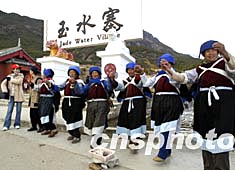 中国农历猴年正月,六名纳西族老太太在云南丽江玉龙雪山脚下的旅游景点前用别致的民族歌舞,向游人表示新年的祝福,借以换取一定的经济来源。中新社记者:赵振清