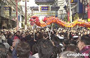 以著名的日本横滨中华街为终点站的“未来港”地铁新线二月一日正式开通,横滨华侨在街头以传统舞龙庆贺这个著名华埠有史以来首次开通地铁。作者:王健