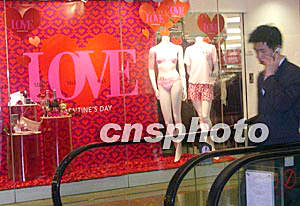 2月2日,香港一百货公司橱窗里写上“LOVE”,并以性感内衣作招徕,象征浓情密意。虽然离2月14日的情人节还有些日子,但是商家的宣传攻势已经让人感受到爱意扑面而来。作者:谭达明
