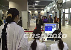 澳门新关闸边检大楼二日开始启用,新的出入境大厅使用了许多先进的设备,图为入境大厅使用的测温设备在入境人员不留意间已经将体温测出。中新社记者:李刚