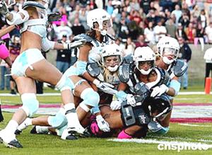 2004年2月2日上午,美国橄榄球“超级碗”决赛在休斯顿举行,同时一年一度的美国“内衣碗”女子“橄榄球赛”也在洛杉矶拉开帷幕,时尚界名模们身着性感内衣参加“比赛”,为“超级碗”助兴。Ic/cnsphoto 摄