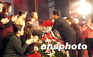 二月四日晚,北京市市民在政协礼堂举行的纪念邓颖超诞辰100周年的文艺晚会上,向邓颖超塑像献花,缅怀这位伟大的女性、慈祥的妈妈。中新社记者:史利