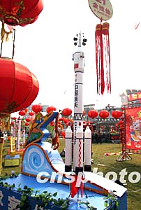 元宵节期间,浙江杭州信义坊广场举行的灯会上展示神州五号飞船模型。作者:吴敏