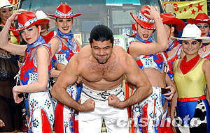 俄罗斯莫斯科马戏团2月5日移师观塘,全新节目首次在香港曝光,包括珍贵的白老虎、杂耍艺术、狗仔足球队、艳丽四射的舞蹈等节目,给观众带来刺激和欢乐。图为马戏团大力士弗克烈甸与艳丽四射的舞蹈女郎。作者:洪少葵