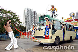 正在香港巡回演出的俄罗斯马戏团2月5日移师观塘,马戏团大力士弗克烈甸施展神乎奇技的力量,将满载演员的公共小巴拉入星辉帐篷。作者:洪少葵
