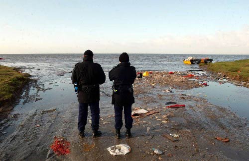 2月6日,两名警察站在英格兰西北部莫克姆湾海滩。据英国警方和中国驻曼彻斯特总领事馆提供的最新消息,5日晚被困在莫克姆湾海滩的被认为是中国人的30多名捡拾贝类者中,目前已有19人死亡,14人获救,另有数人下落不明。新华社/法新