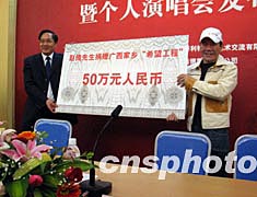 二月九日,祖籍广西天等县的台湾歌手赵传(左)在南宁市捐资五十万元人民币,帮助天等县龙茗中学改善教学环境。作者:唐安军