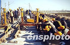 二月九日,京广线郑州段双桥车站正在安装目前中国国内最先进的铁路提速道岔。列车通过此道岔的时速将由过去的四十公里提高到八十公里,并且没有咔嚓声。作者:慎重
