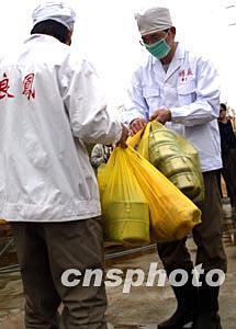 广西南宁市良凤农牧公司工作人员十一日为饲养员送来晚饭,这家年产商品代鸡苗1500万羽的养殖场,一直坚持严格的规章制度,养殖场不许无关人员进入,饲养员的一日三餐都要专人送取,确保场内无病菌。中新社记者:宋吉河