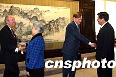 国务院副总理吴仪、商务部副部长于广洲(右一)十二日在北京会见美国贸易代表佐利克一行。中新社记者:满会乔
