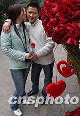 情人节之日,一位北京男士在红玫瑰花和同心结前喜得女友浪漫的一吻。中新社记者:史利