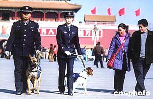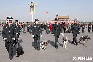 2月15日,北京市公安局刑侦总队警犬侦察训练大队的民警带着警犬在天安门广场巡逻。从当日起,来自北京市公安局刑侦总队警犬侦察训练大队的警犬,将每天陪伴巡逻民警在天安门广场执行搜寻危险品等巡逻任务。
