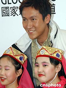 香港艺员马德钟二月十七日出席在香港举行的“马可波罗现代东游记”摄影展开幕式,与表演新疆舞的小朋友一起拍照。作者:钱兴强