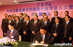 二月十七日,中国内地与香港建设、保险行业专业人士资格互认协议签署仪式在北京饭店举行,中国商务部副部长安民、香港特区政府财政司司长唐英年等出席了签署仪式。中新社记者:武仲林