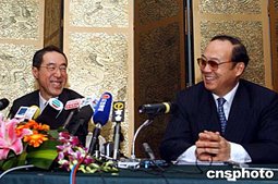 中国商务部副部长安民(右)、香港特区政府财政司司长唐英年等出席了签署仪式,并就相关问题回答了记者提问。中新社记者:武仲林