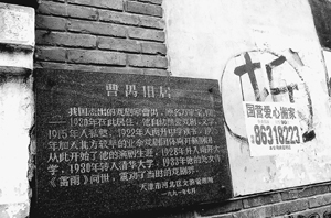 2月16日,记者(注:人民日报记者)在天津民主道23号曹禺旧居院墙上看到,紧挨着天津市文物局和天津市河北区文物管理所等单位悬挂的两块曹禺旧居纪念牌的,是一个约60厘米高的墨写的“拆”字(如图),旁边还张贴着花花绿绿的各类“搬家公司”的小广告。旁边有的住家已人去楼空,三三两两收破烂的外地人正在曹禺故居外来回转悠。