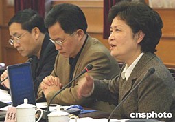 二月十八日,中国教育部举办新闻发布会介绍基础教育课程改革措施。教育部新闻发言人朱慕菊(右一)表示,要通过基础教育课程改革促进学生健康快乐地成长。中新社记者:张勤