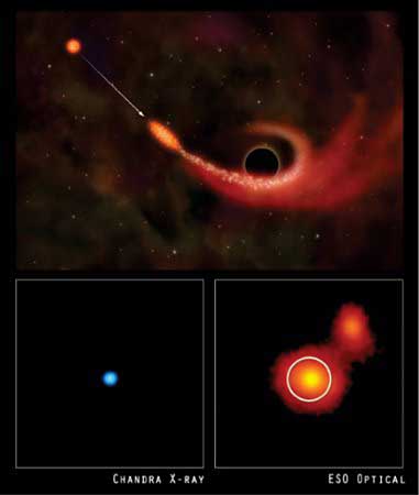 天文学家相信,被撕裂和部分吞噬的恒星是因为另一颗恒星扰乱了它的轨道,令其太过靠近黑洞而遭此“厄运”的。
