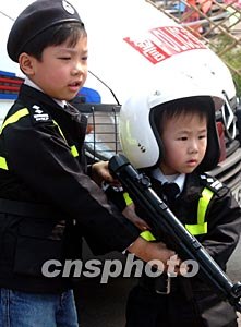 香港西区警区联同中西区灭罪行委员会,二月二十二日举行灭罪跑嘉年华活动,该活动的目的是透过有益的活动宣传灭罪讯息并推广健康生活,图为两位小朋友对展示的警务器械颇感兴趣。中新社记者:钱兴强