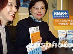 中信嘉华银行二月二十六日在香港推出优越个人人民币服务,“RMB+中港一线通服务”,包括个人人民币服务及与CEPA相关的商业服务,专为需要中国有关的银行服务客户提供增值的财务配套支持。图为该银行执行副总裁林刘德美(右)和高级副总裁李笑英向传媒介绍优越个人人民币系列服务内容。作者:钱兴强