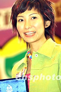 香港艺人朱凯婷,2月29日为“香港2003至2004年度沙田区扑灭罪行活动闭幕典礼”主持节目。作者:洪少葵