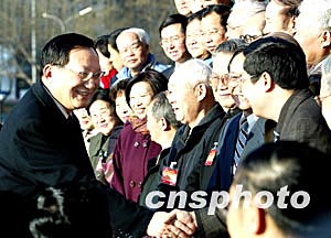 三月一日,中国国务委员唐家璇(左一)出席在北京举行的中国人权研究会第二届全国理事会二次会议并讲话。中新社记者:郑萍萍