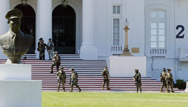 3月1日,美军士兵在海地首都太子港的总统府守卫。