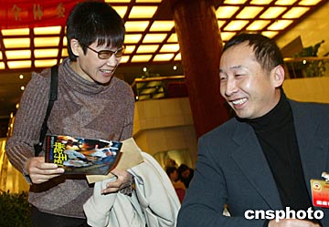 全国政协委员、导演冯小宁,二日在北京向刚刚报道的世界速滑冠军叶乔波委员赠送他的新影片《举起手来》海报。该片号称是中国版的《虎口脱险》,是冯小宁推出的一部战争喜剧大片。中新社记者:满会乔