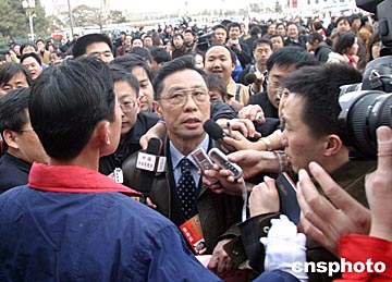 下午二点多,距全国政协十届二次会议开幕尚有半个小时,但人民大会堂前已聚满海内外记者,各路英雄架起长枪短炮,敬候“猎物”。