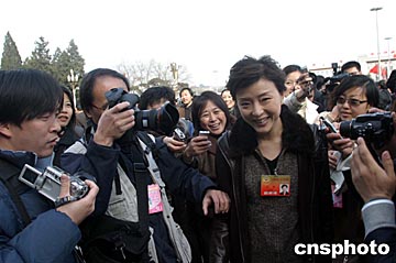 三月三日,全国政协十届二次会议在北京召开,全国政协委员杨澜成为记者追逐采访的对象。中新社记者:张勤