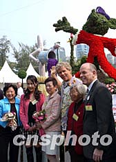 3月5日,出席“2004年香港花卉展”的民政事务局常任秘书长李丽娟、香港旅游发展局主席周梁淑怡议员等嘉宾,在香港迪斯尼乐园设计的花坛摊位留影。作者:洪少葵