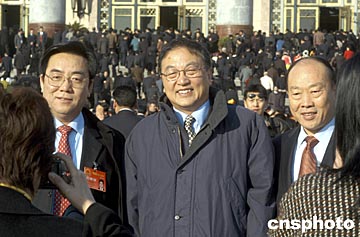 三月六日,联想控股公司总裁柳传志(中)、首钢董事长朱继民(右)、北京燕京啤酒集团董事长李福成出席十届全国人大二次会议前在北京人民大会堂前合影。中新社记者:张宇
