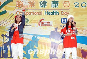 歌星何韵诗3月6日在香港出席由职安局及劳工处举办之《职安健康日2004》开幕典礼活动,「职安领队」何韵诗带领出席嘉宾及歌星进行健康操,宣扬职业安全信息。作者:邓庆乐