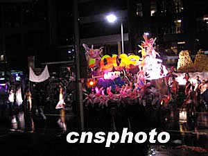 澳洲第一大城市悉尼6日晚举行同性恋大游行,十万人冒雨上街看热闹。几十辆花车、数千人的化装游行队伍在雨水中缓缓行进。最后一辆花车上书“要爱不要战争”。 中新社记者 刘雨生 摄