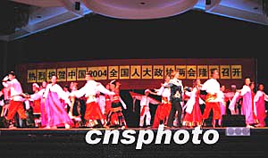 (美国东部时间)三月六日晚,来自世界各地的两千多人参加了在纽约举办的二○○四年“科学、健康、文明”学术研讨会。图为大会开幕晚宴上,与会的学子载歌载舞,祝贺中国全国人大、政协会议三月初在北京召开。作者:陈建