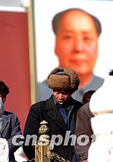 图为一位农民于三月份第一个周末在北京天安门前参观游览。中国国家总理温家宝在日前所作的政府工作报告中有关“一年降低一个百分点,五年内取消农业税”的承诺,为全中国的农民所瞩目和期待。中新社记者:武仲林