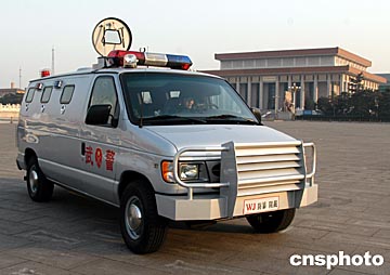 执行“两会”安全保卫的武警新式防暴车在北京天安门广场执勤。中新社记者:张宇